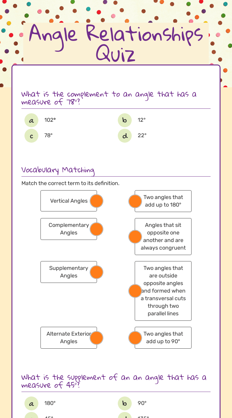 Lines and angles online activity for grade 9. The sort the angles based on their relationship. Complementary, supplementary, vertical, or adjacent. Name an angle or angle pair that satisfies each condition. • find angle measures using the theorem.
